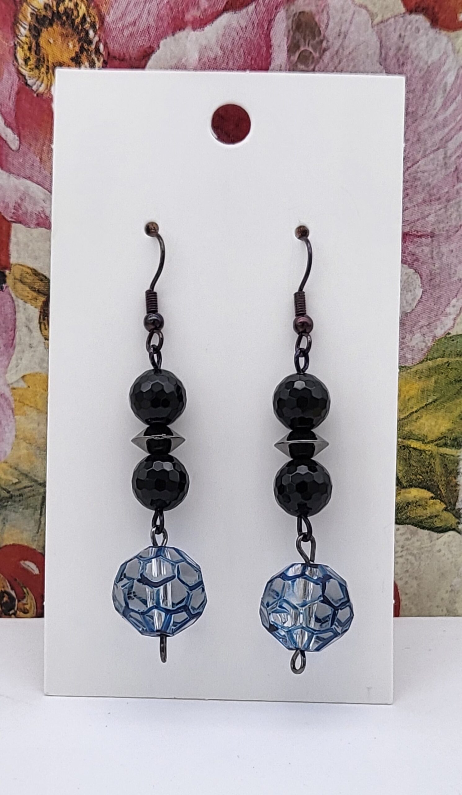 zwarte facetgeslepen kralen in agaat, en een kraal handgeschilderd in raat