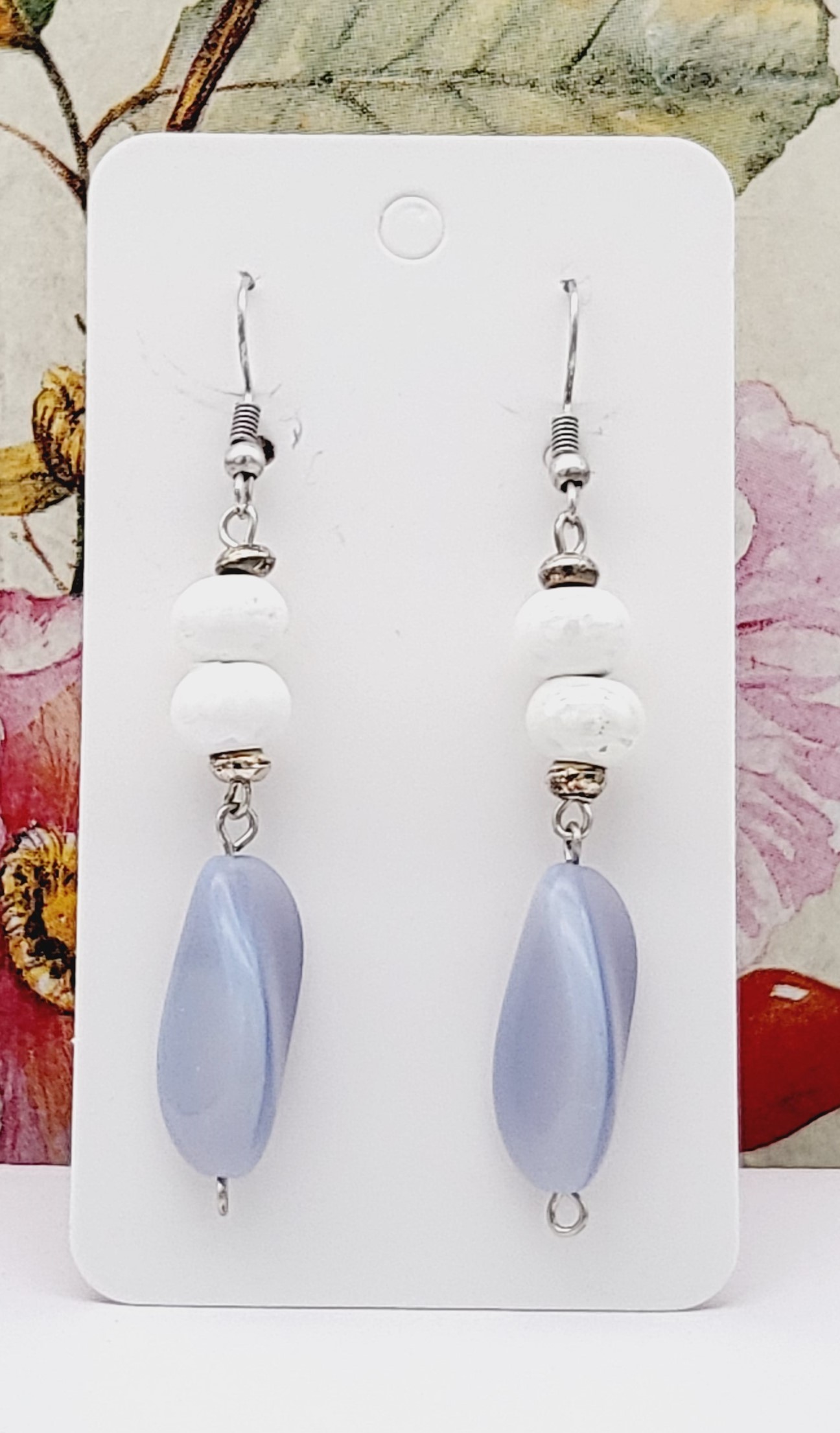 witte kraaltjes van keramiek, paarse gedraaide kralen van glas